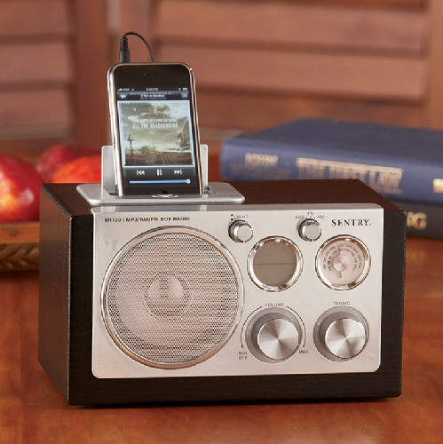 - Black iPod/CD/radio boombox with built-in iPod docking station