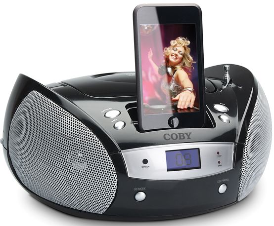 Share your digital music on the go, with Coby’s portable CD boombox for iPod. Snap any iPod into the CSMP140’s universal dock for high-quality playback of your music library, or slip a disc into the built-in, top-loading CD player.
