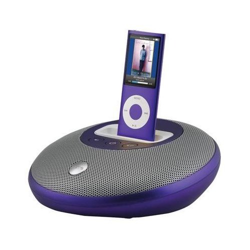 Portable Speaker System for iPod Purple. Inlcudes Apple’s universal dock, compatible with every iPod with dock connector. Plays and charges docking iPods.