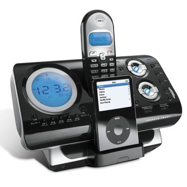 Bedside radio/alarm clock with dock for iPod with stereo speakers and a cordless phone.